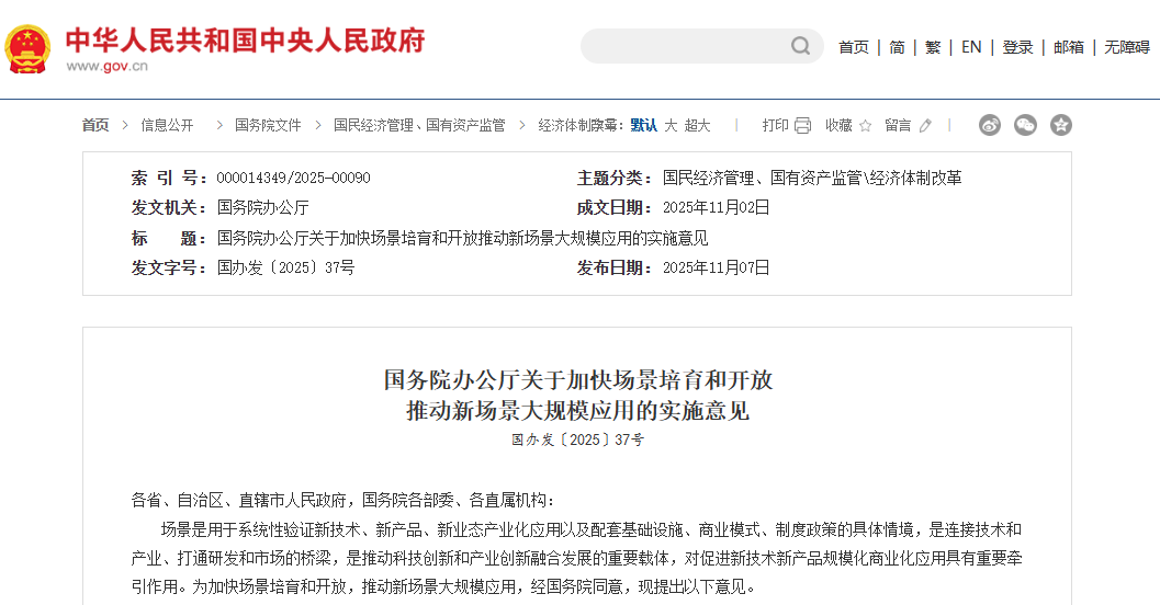 11月7日,国务院办公厅印发《关于加快场景培育和开放推动新场景大规模应用的实施意见》(以下简称《意见》)。